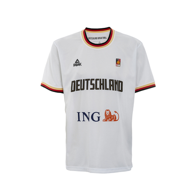 Das PEAK-Shooting-Shirt der aktuellen Deutschland-Basketball-Kollektion ist ideal zum Aufwärmen, Laufen und für die Pausen zwischendurch. Freu Dich auf ein atmungsaktives, sehr leichtes und weiches Material, ergänzt durch elastische Bündchen am Ausschnitt und Ärmeln in den Deutschlandfarben. Der gerade Schnitt und der bequeme Ärmelausschnitt geben genügend Platz für Action auf dem Platz und in der Fankurve. Ein schwarzer Deutschland-Basketball-Schriftzug verläuft quer über den Brustbereich und wird durch das DBB-Logo auf der linken oberen Brust ergänzt. Im unteren Bereich befinden sich sowohl auf der Vorder- als auch der Rückseite die Sponsorenlogos. Das Shooting-Shirt kann mit individuellen Spielernummern und Namen veredelt werden.