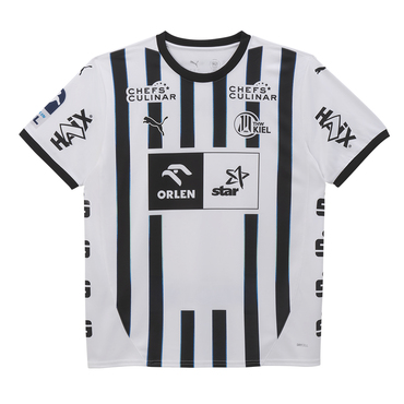 Schwarz-weiße Streifen auf dem Trikot gaben den Spielern des THW Kiel in den Anfängen des Traditionsclubs den Beinamen "Zebras". Jetzt kehren die Streifen zurück auf die Jerseys. Die auch optische Verbindung zwischen den Feldspielern und den THW-Torhütern schaffen beim Heimtrikot des THW Kiel die zarten, farbigen Akzente, die die Streifenoptik des Trikots unterstreichen.